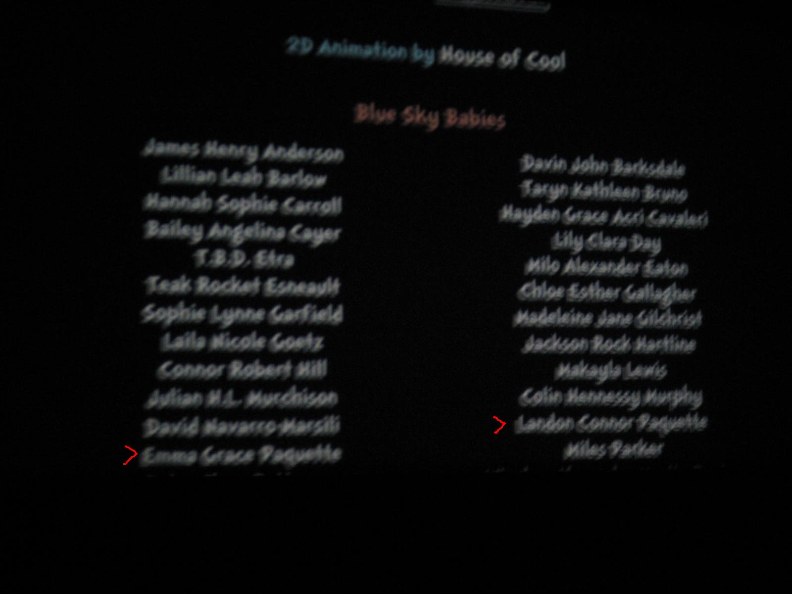 There’s a tradition at Blue Sky Studios to post all “production babies”(meaning babies born during the production of the movie), in the credits of the movie. My twins Landon Connor & Emma Grace were born a year ago in January, so they had thier names are in the credits.