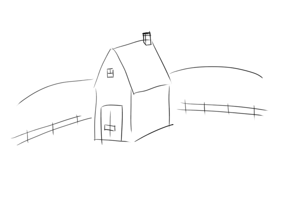 My father used to oil paint and his work was found hanging in every family member’s house I can remember. He stopped painting before I was born and, to this day, I’m still after him to get a paint brush in his hand. He was the first person to teach me the concept of perspective in my drawings at the early age of 8 years old. I can still remember being at our dining room table while he drew a sketch of a barn and explained vanishing points to me. The sketch was crude, but in the eyes of an 8 year old it was a masterpiece. Here is my representation of what that sketch looked like: