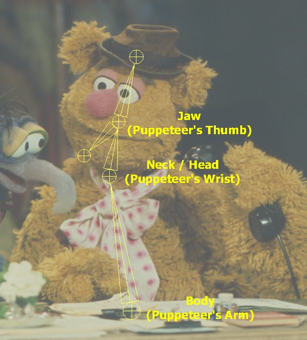 If you were to break down the anatomy of a puppet in computer animation “rigging” terms, a traditional “hand and glove” puppet (like Cookie Monster, Ernie or Fozzie) is nothing more than a body mover, neck/head mover, and jaw mover with articulated hands (hence the name “hand and glove”)and a completely neutral facial expression.