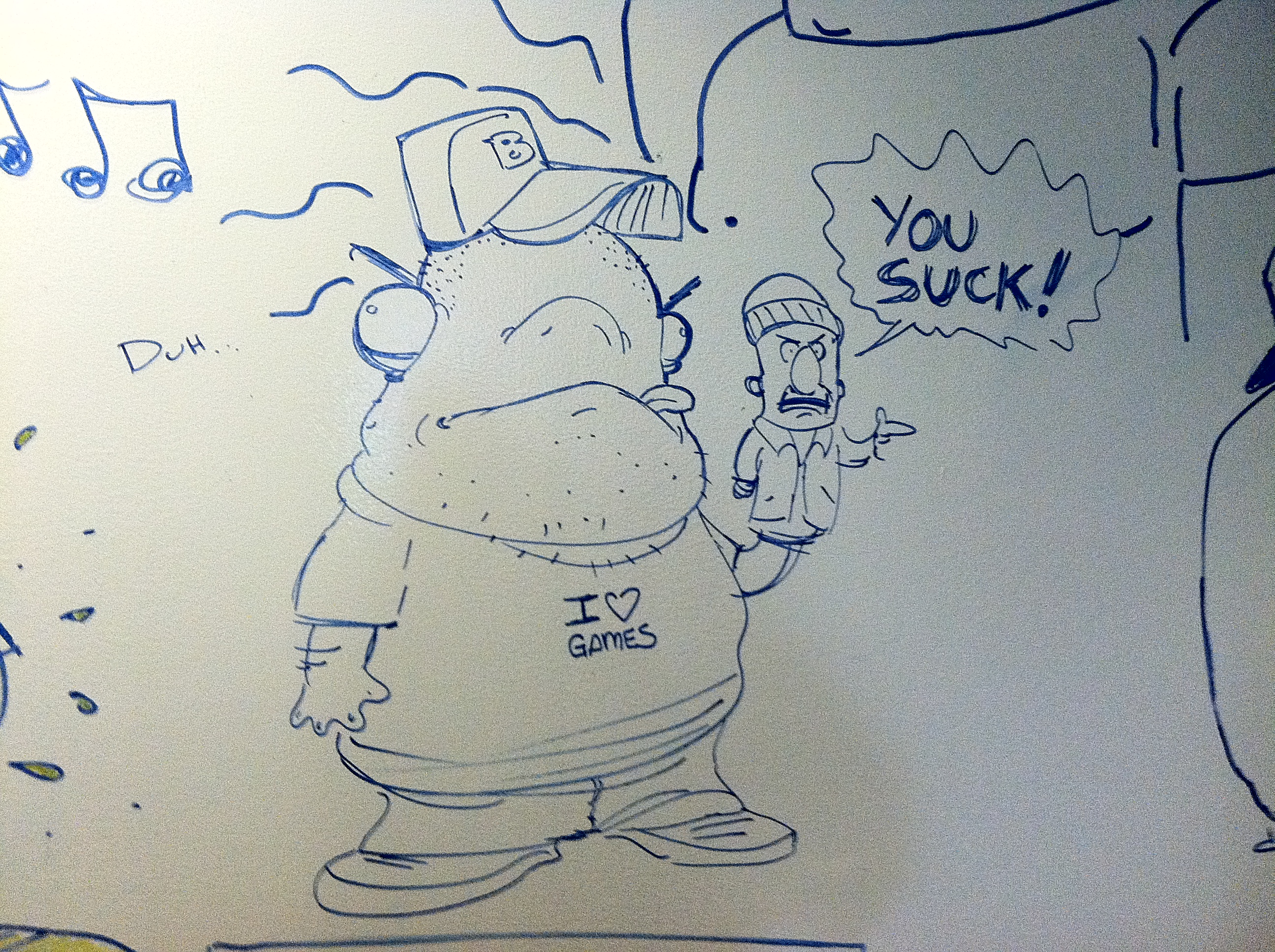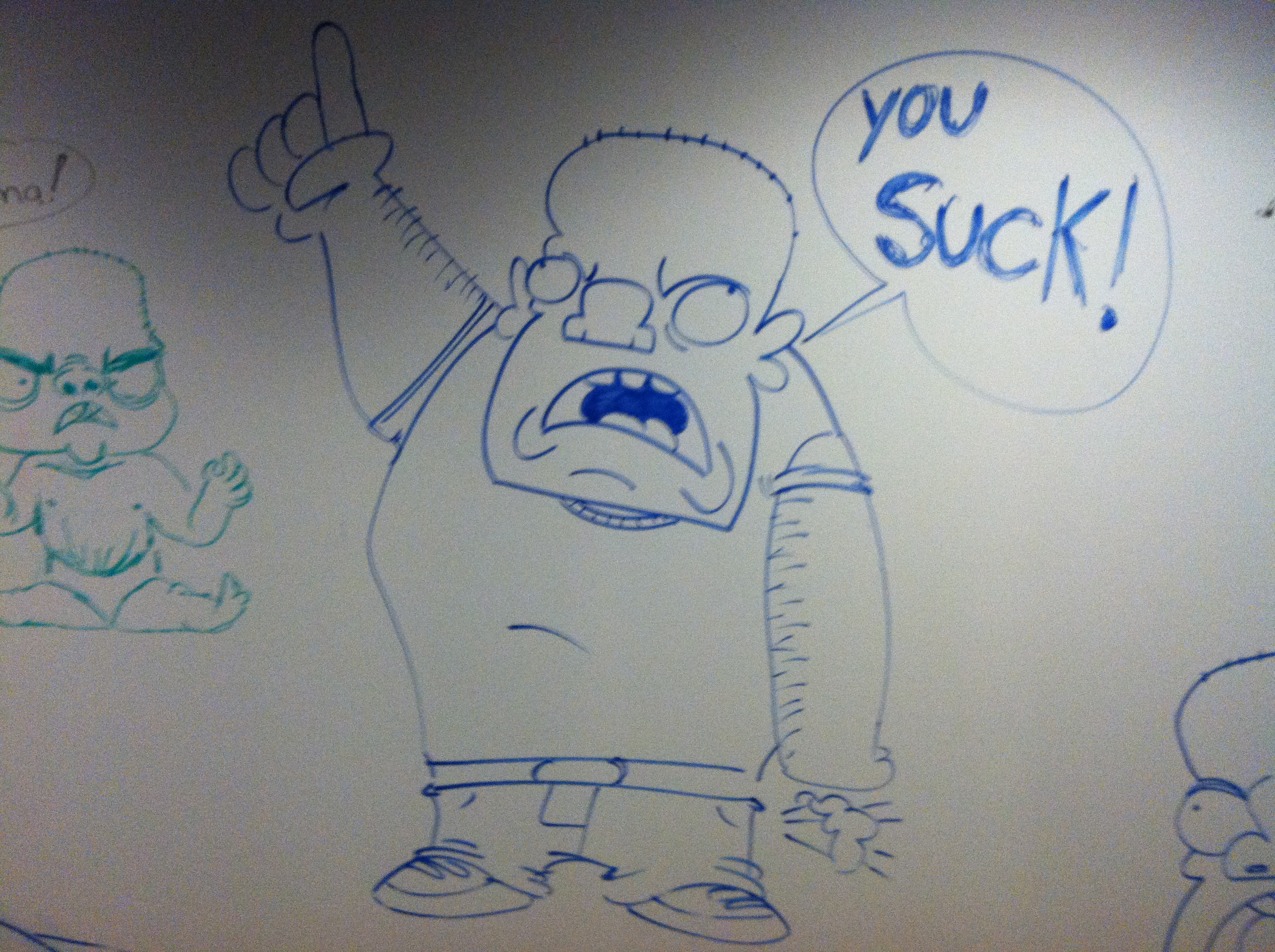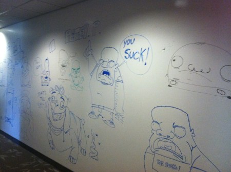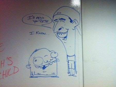 The team also bombarded the dry-erase board with caricatures of yours-truly.